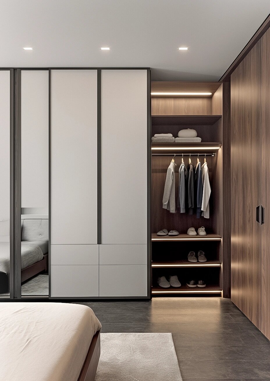 设计上超用心,开放式与封闭式柜体结合,开放式区域用暖光烘托,找衣物一目了然;封闭式柜体藏起杂物,让空间整洁又有呼吸感。不同区域划分清晰,挂衣区、叠放区、鞋履区等,把收纳需求全安排明白,再多衣物也能井井有条。