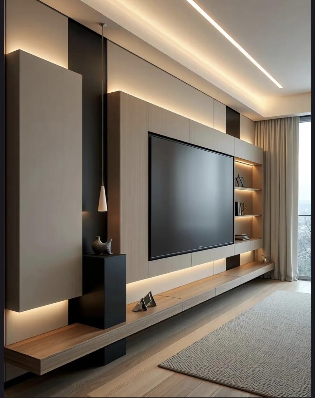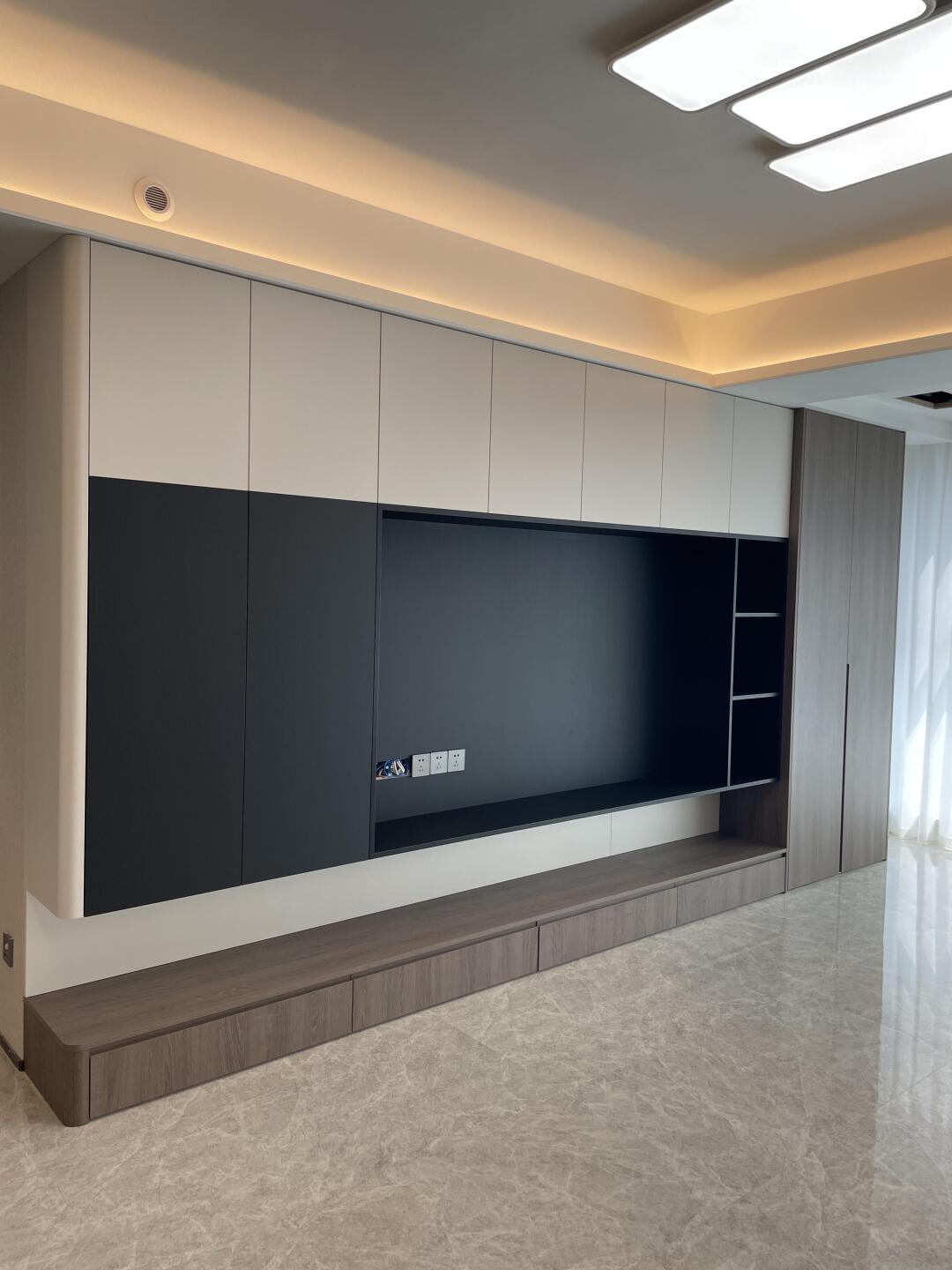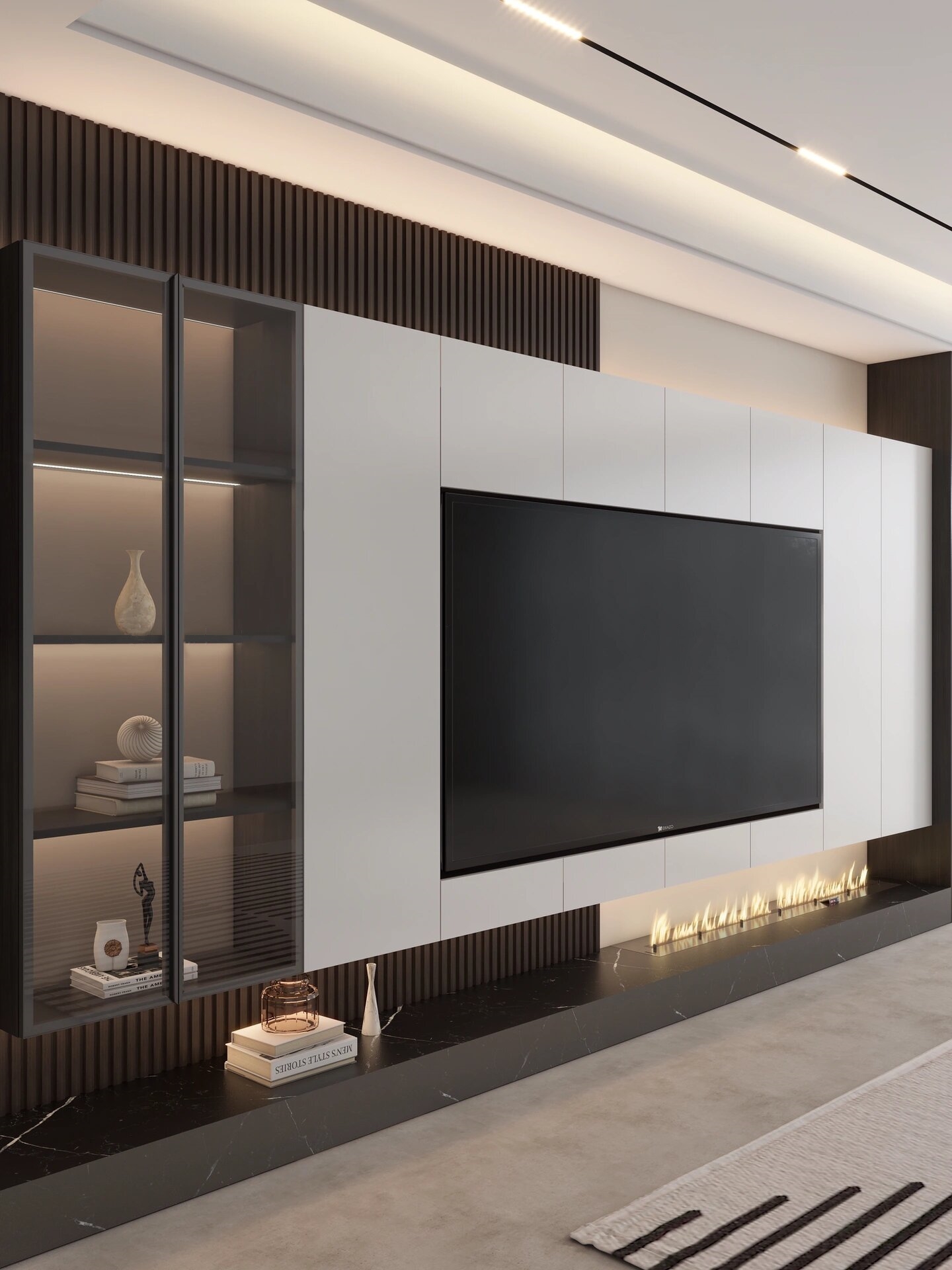 第二款,灯光设计太惊艳!线性灯和局部照明结合,层次丰富又温馨。柜体深浅木色与黑色碰撞,高级感拉满,开放式储物格还能摆放书籍、摆件,好看又能满足收纳,超戳人~