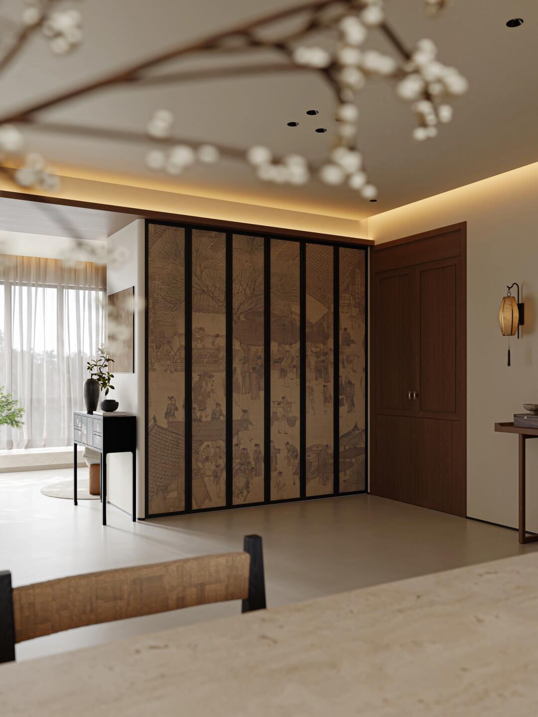 古朴的花瓶、雅致的字画、带有传统纹样的屏风等摆件,似是从历史中走来,为空间注入深厚文化底蕴,每一处陈设都似在诉说宋人的雅致生活意趣。