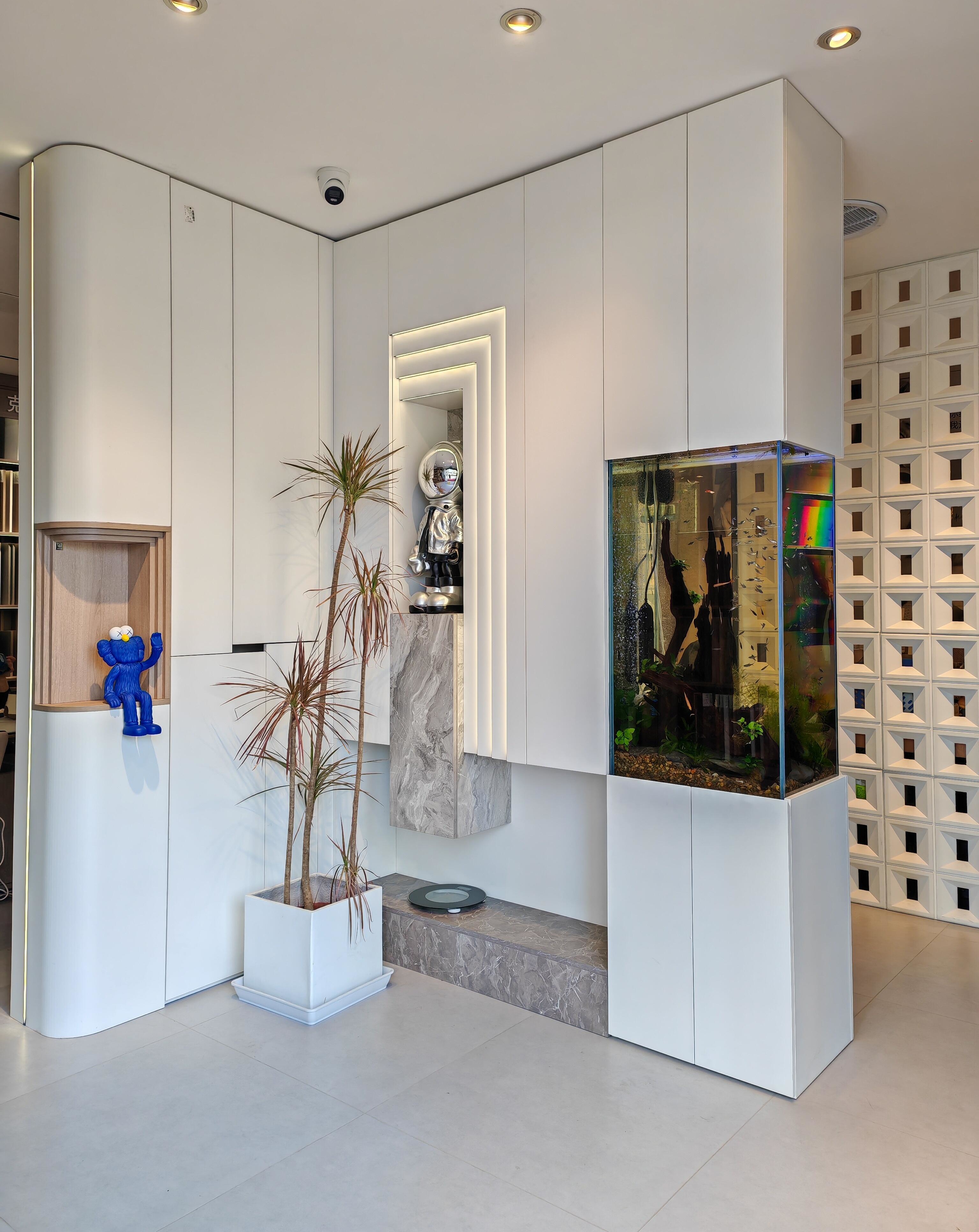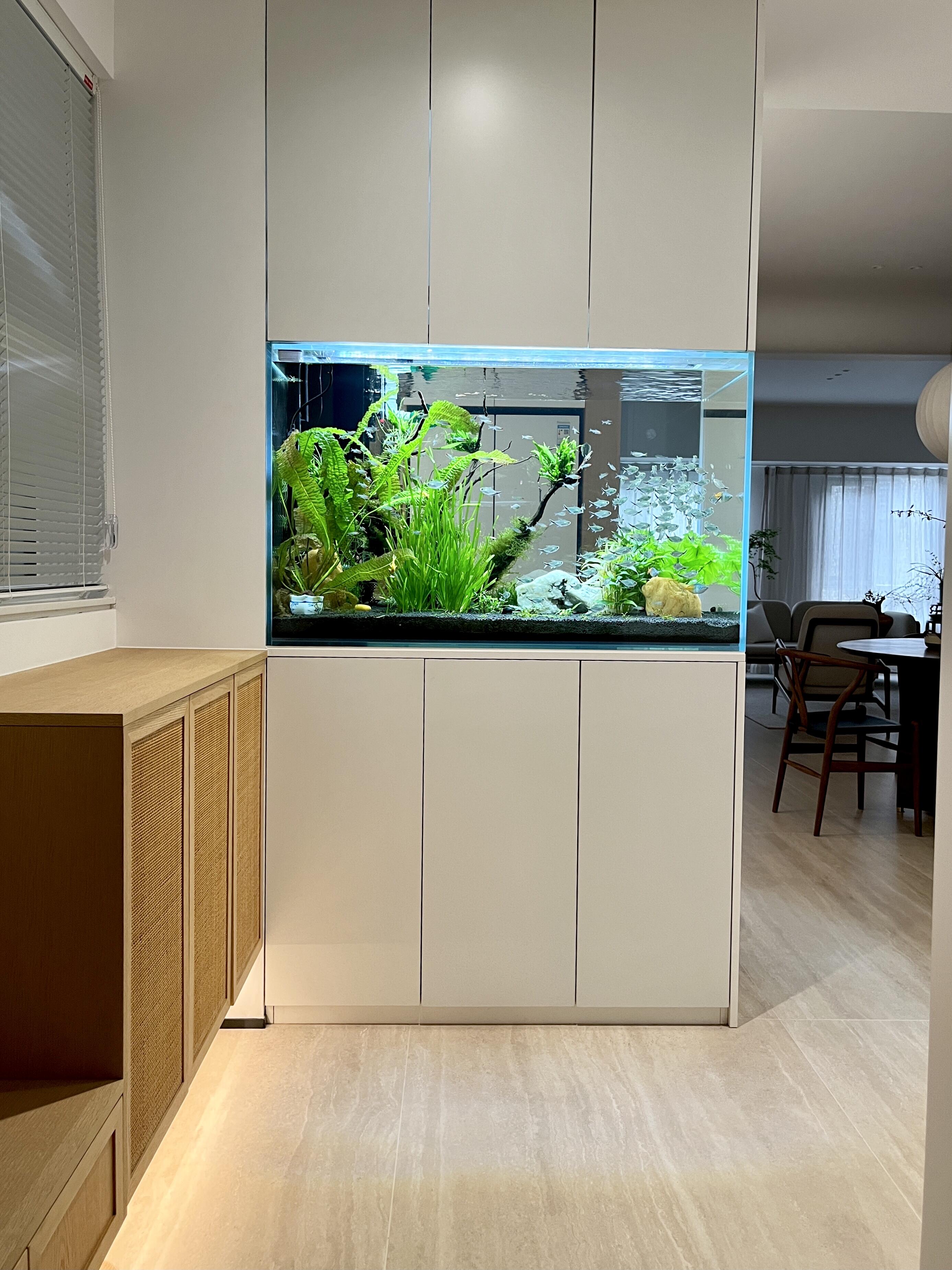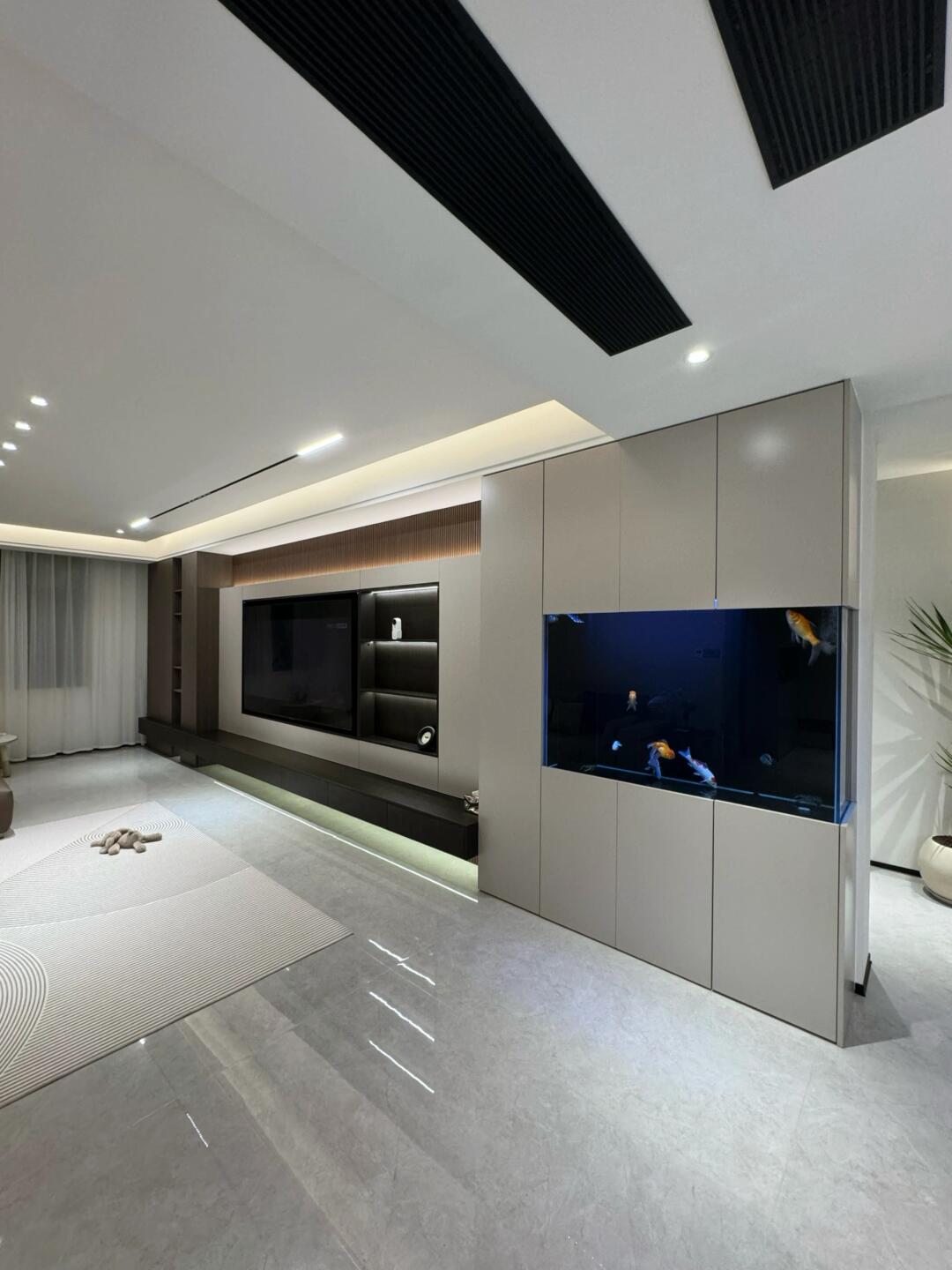 现代简约风里,与简洁柜体结合,以干净线条、素雅色调,让鱼缸成为空间自然延伸;