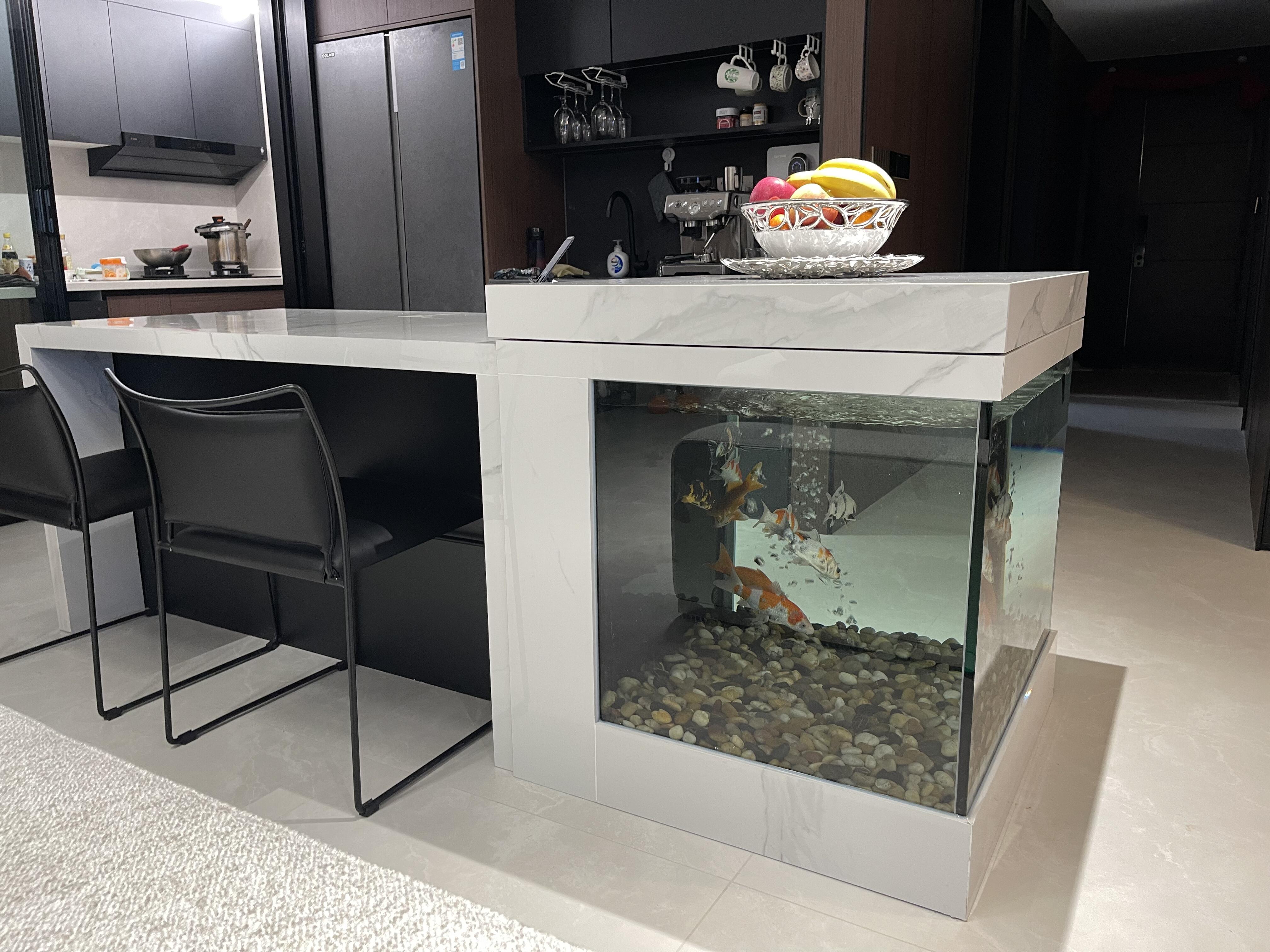 在设计上,它高效利用墙体或柜体空间,解决传统鱼缸占独立空间的问题。且嵌入式结构使其成为视觉焦点,水中游鱼与造景呼应,为空间注入自然生机,无论是客厅作为艺术点缀,还是厨房增添生活意趣,都能打破水族与空间的边界,让水族艺术深度融入空间肌理,为居住者打造独特且富有生机的居住体验。