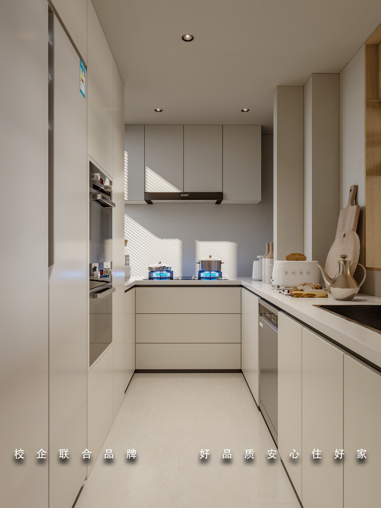 空间利用方面颇为用心,采用开放式或半开放式的布局思路,使各功能区既相对独立又能相互联动,减少了空间的割裂感。厨房的 U 型布局,合理分配操作区域,提升了使用效率;