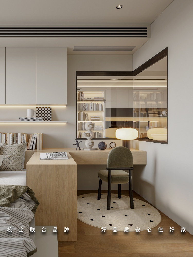 卧室与工作区的融合设计,在有限空间内满足了休憩与办公的双重需求,玻璃元素的运用也增强了空间的通透度,整体实现了在小户型中对舒适与实用的较好营造。