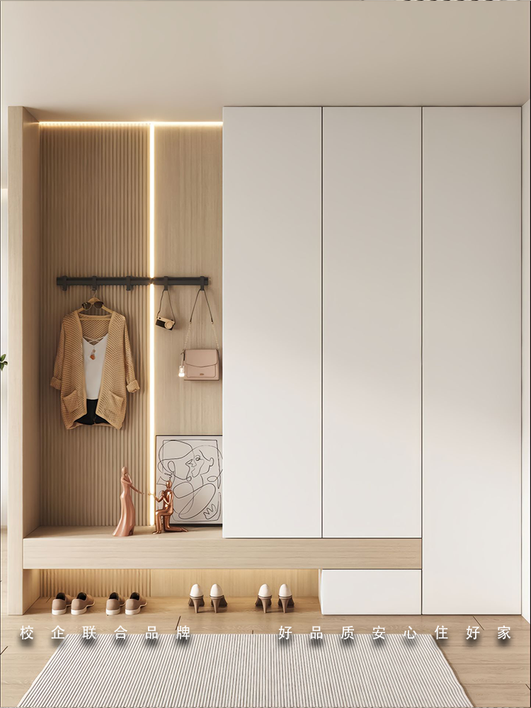 玄关处,柜体与开放挂放区巧妙结合,灯带点缀增添层次感,归家瞬间便被温柔包裹。