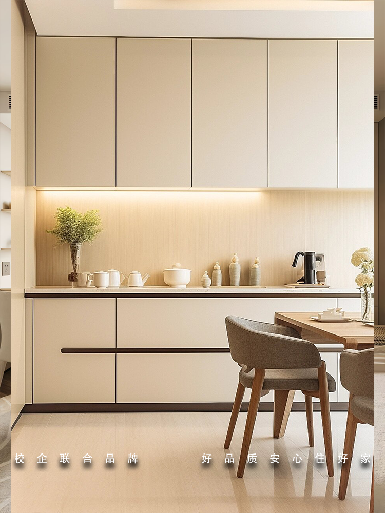 餐厨区域,一体化定制柜体让空间整洁有序,同色系搭配和谐自然,烹饪用餐都成了享受。