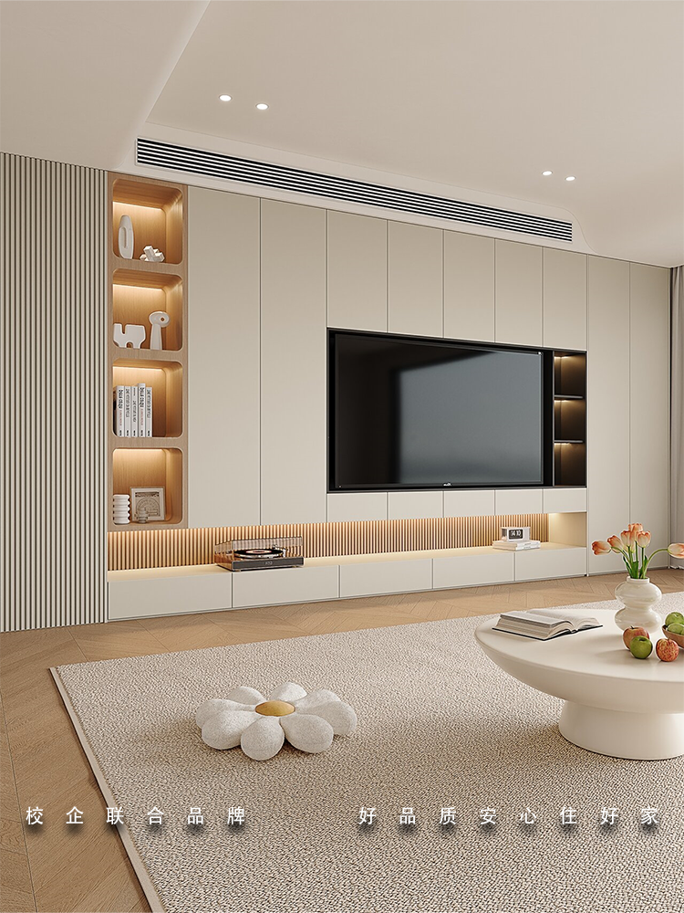 还有客厅的电视背景墙,定制柜体兼具收纳与展示功能,灯光加持下,摆件与书籍都成了艺术点缀。