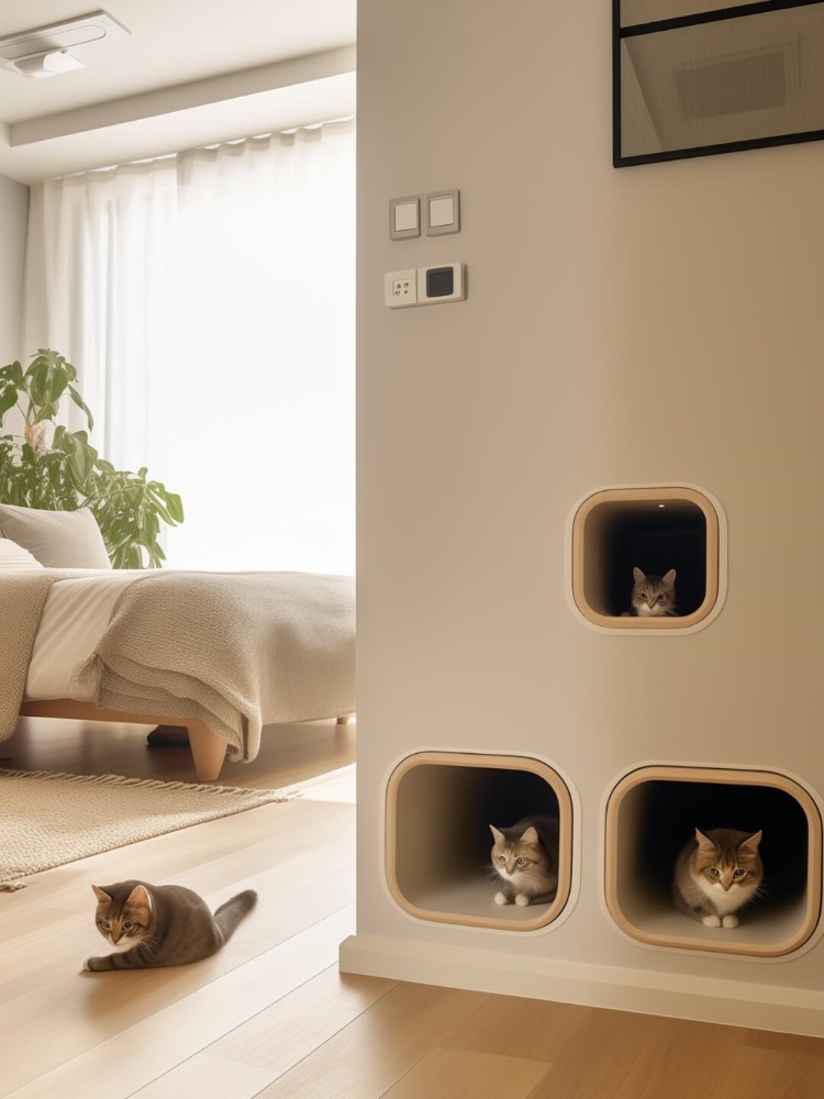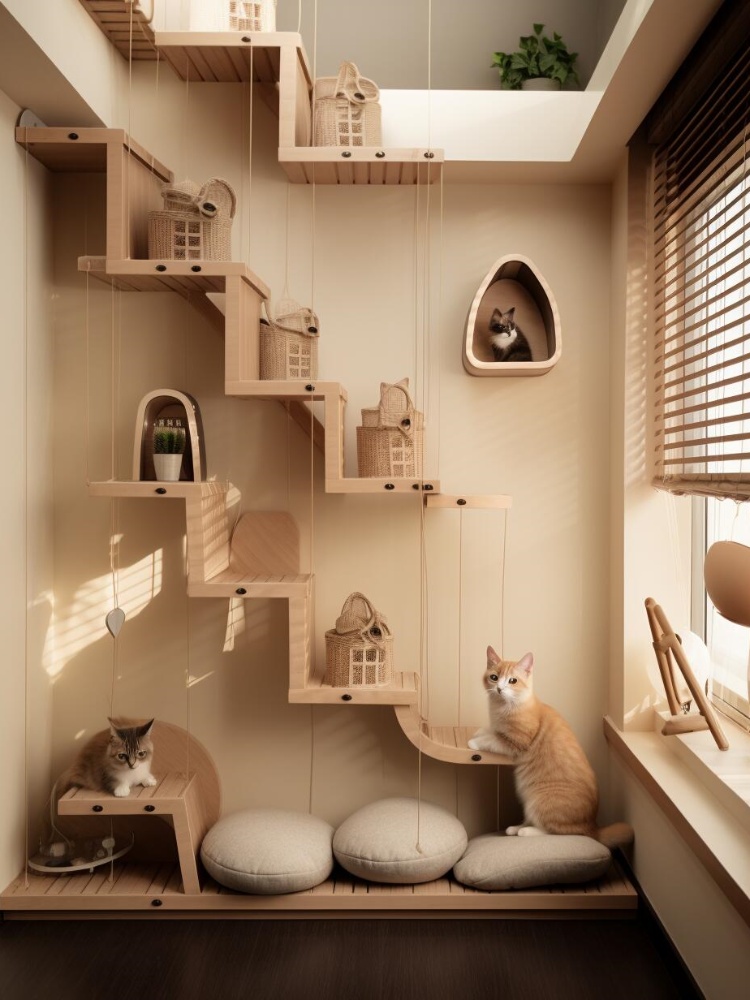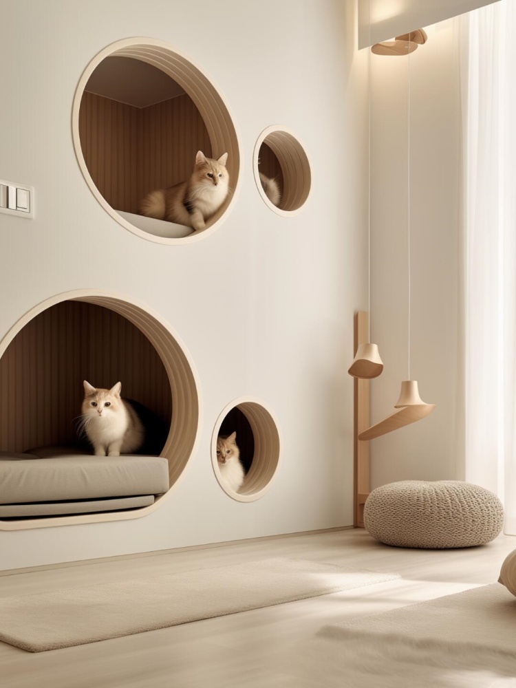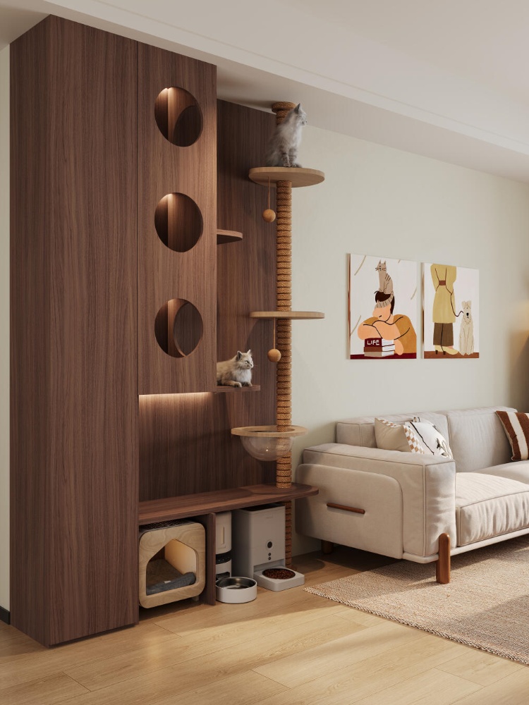 设计思路上,紧扣猫咪 “攀爬、躲藏、观景” 的天性,以嵌入式猫洞、多层木质架构等形式,将猫屋巧妙融入墙体、角落,让每一处设计既是猫咪的玩乐休憩地,又是家居的美学点缀。