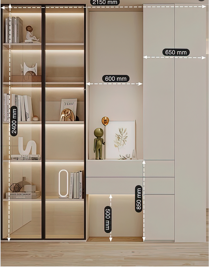 也有主打轻奢展示的款式,玻璃柜体搭配内嵌灯带,珍藏的包包、摆件在此成为艺术点缀;