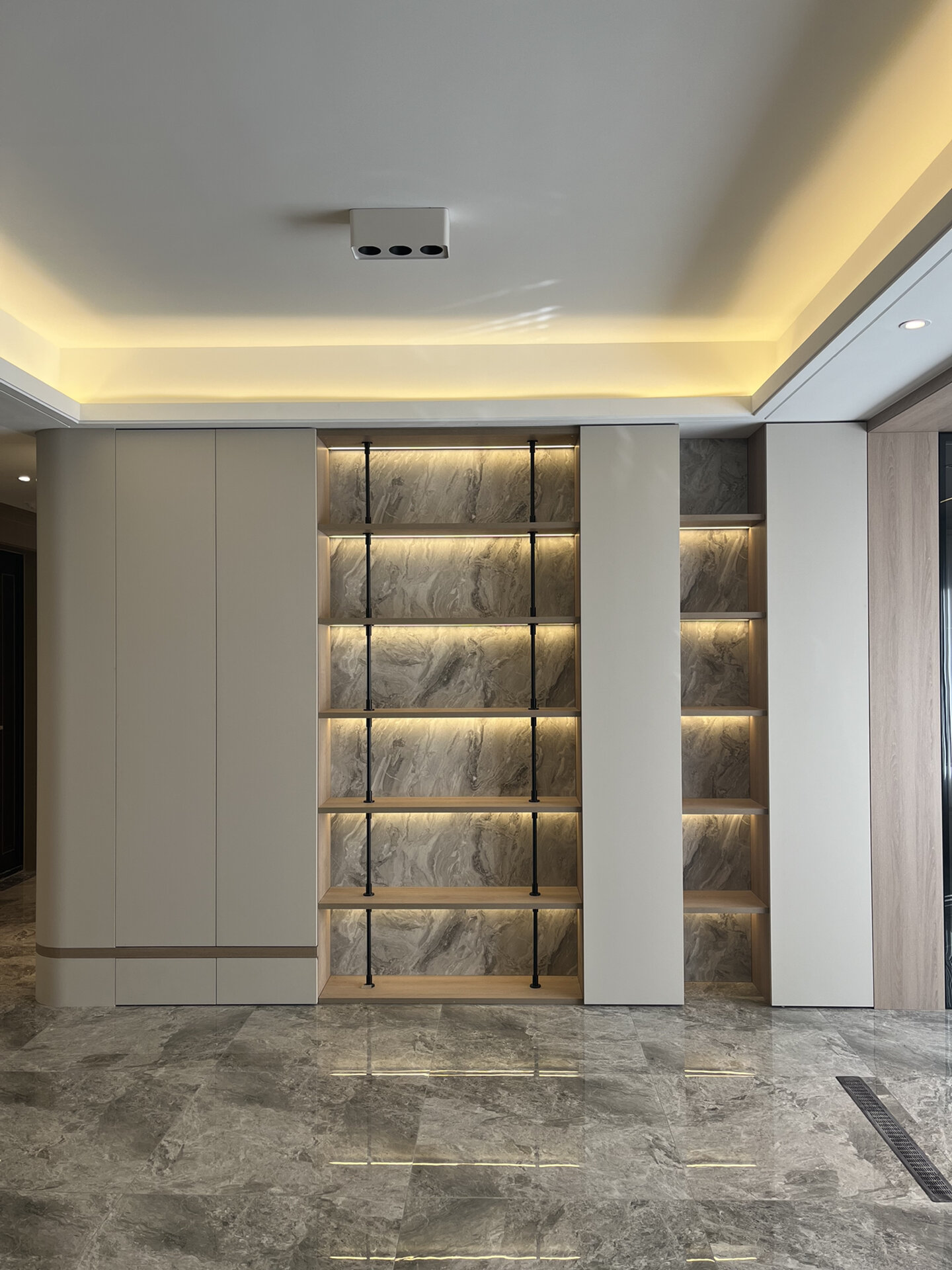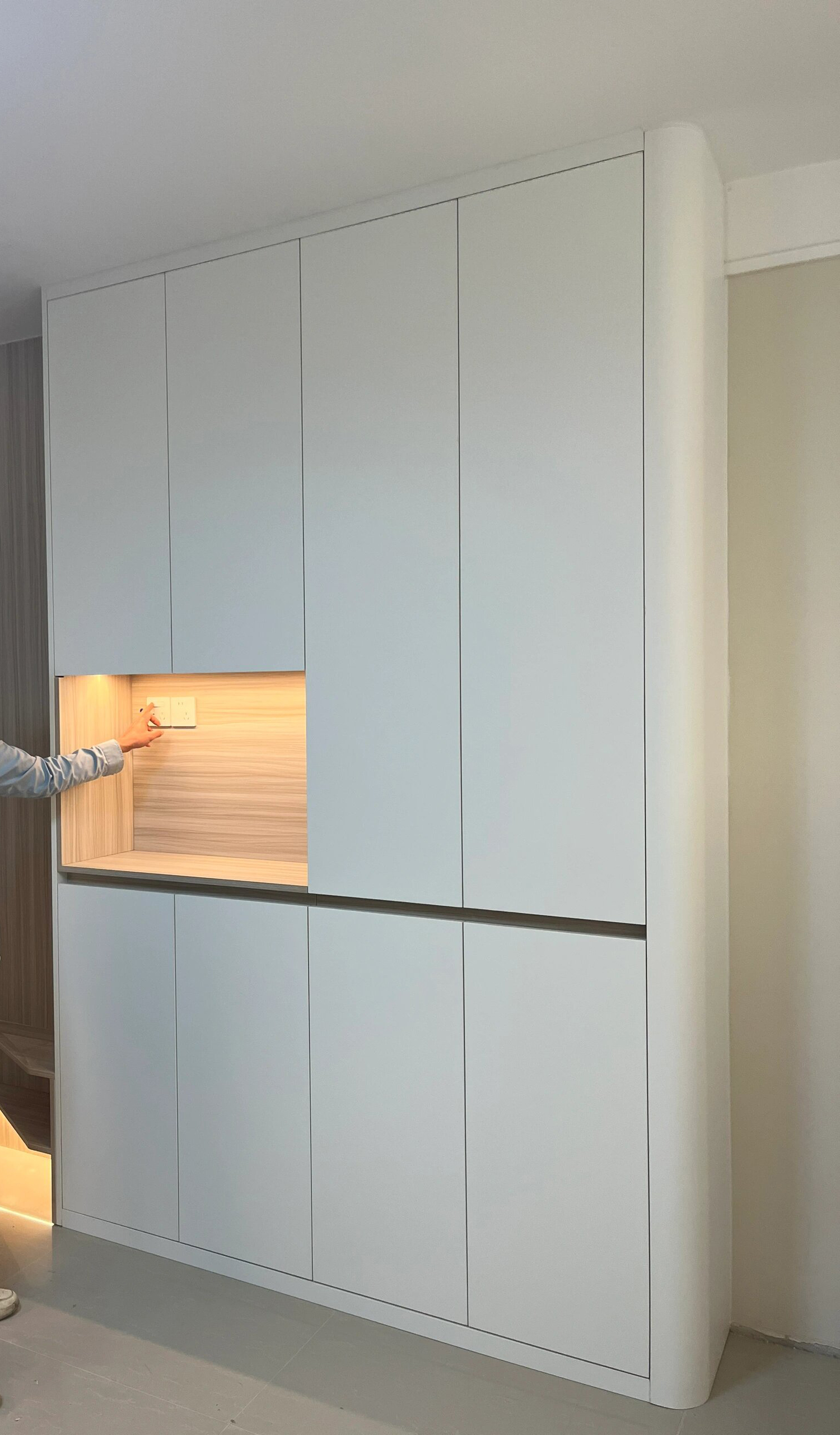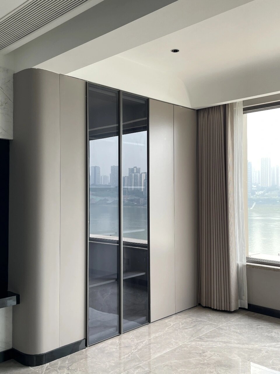 拒绝直角的刻板!弧形柜用流畅线条适配各种空间,浅灰柜体 + 玻璃柜门,通透又高级。