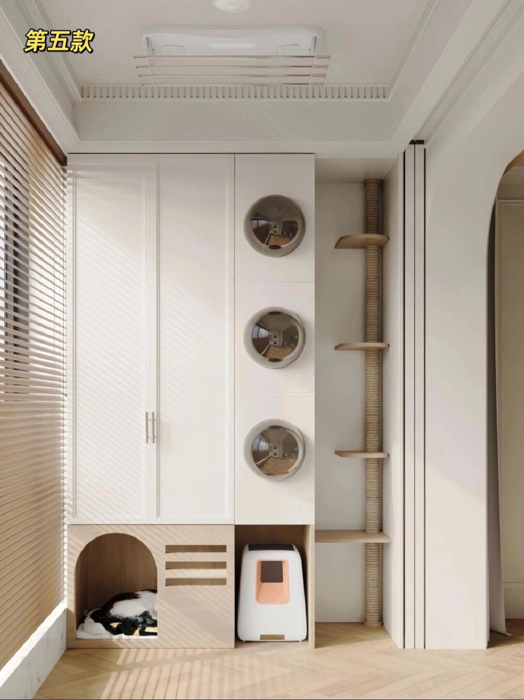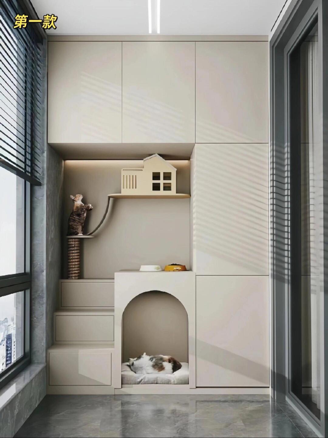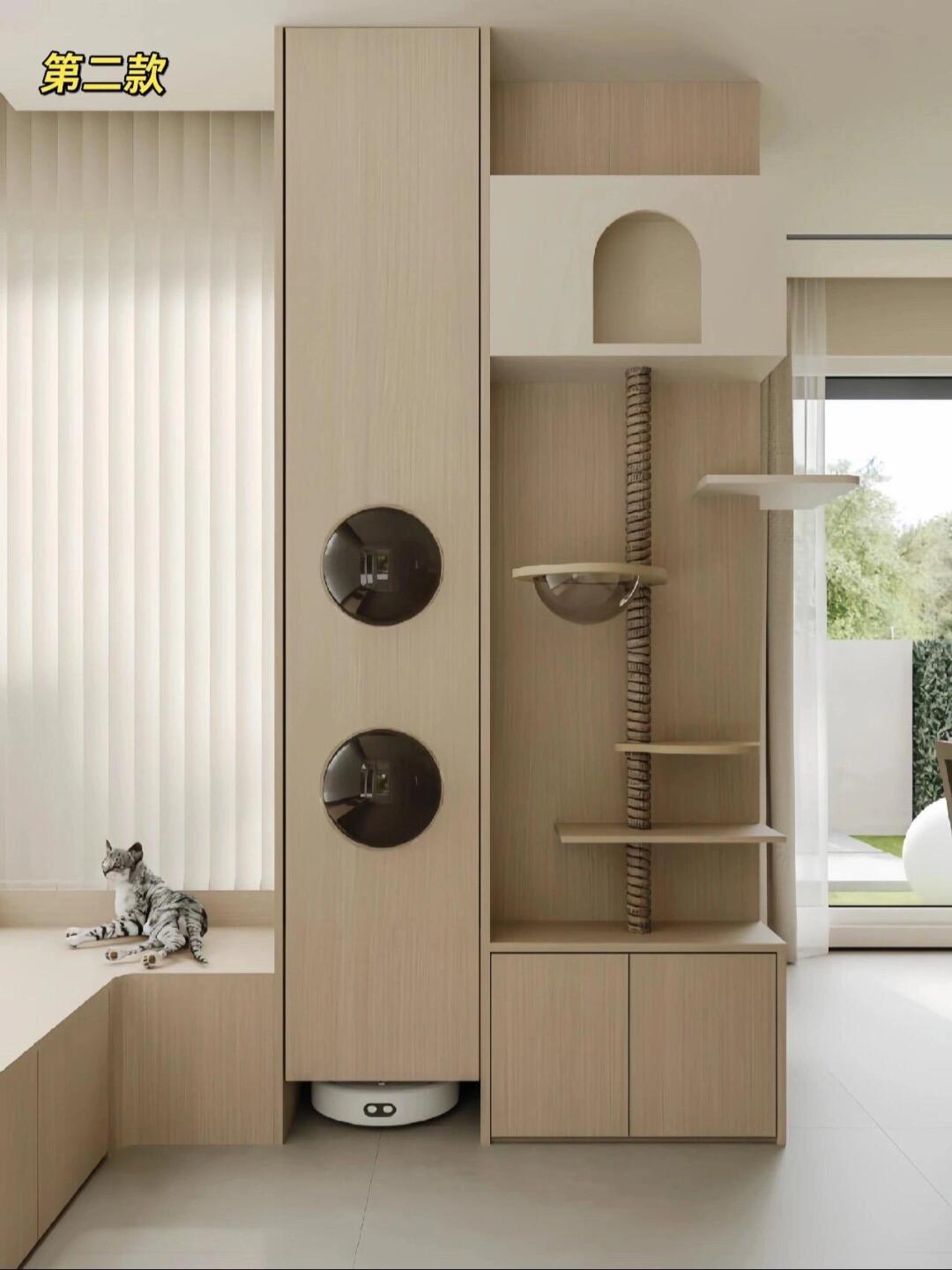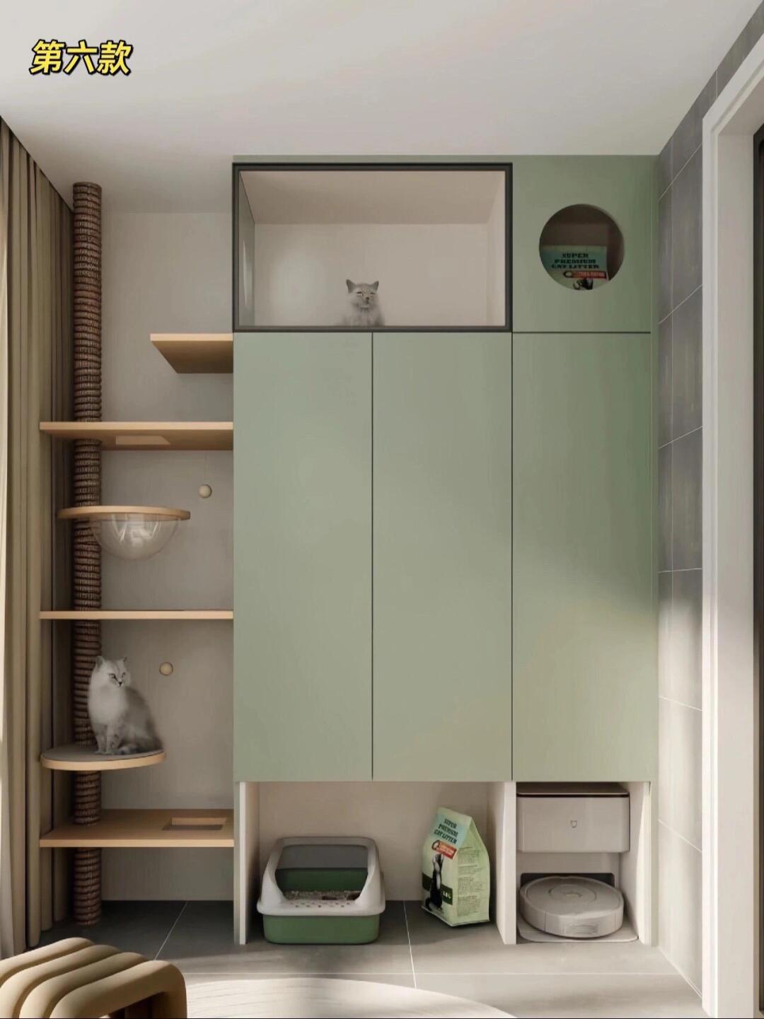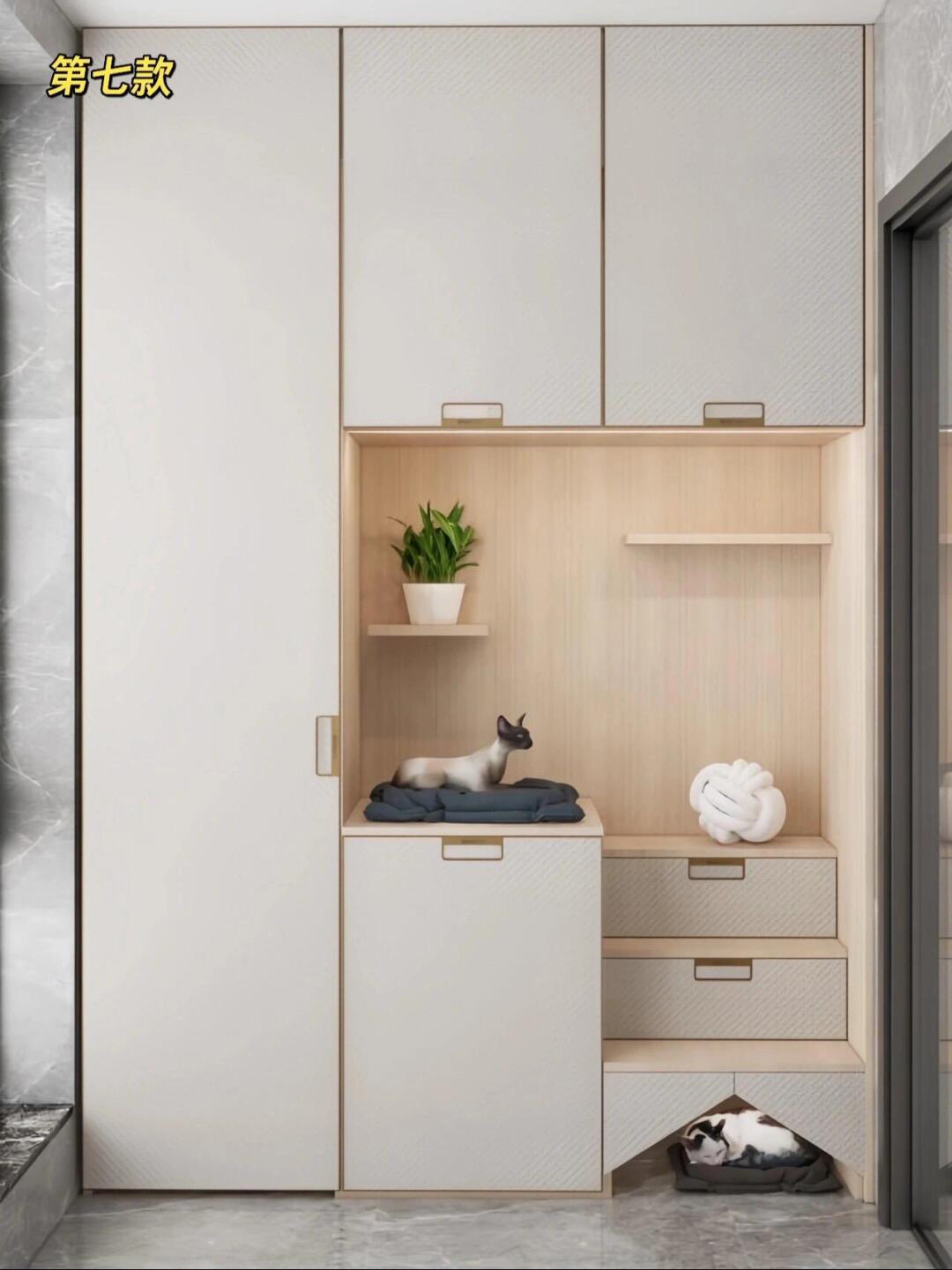 这 10 款猫柜精准拿捏了猫咪 “跑上跑下” 的天性:垂直空间里嵌满猫爬架、猫抓柱,有的连到顶柜,有的延伸到墙面,让猫咪随时能蹦跳玩耍;