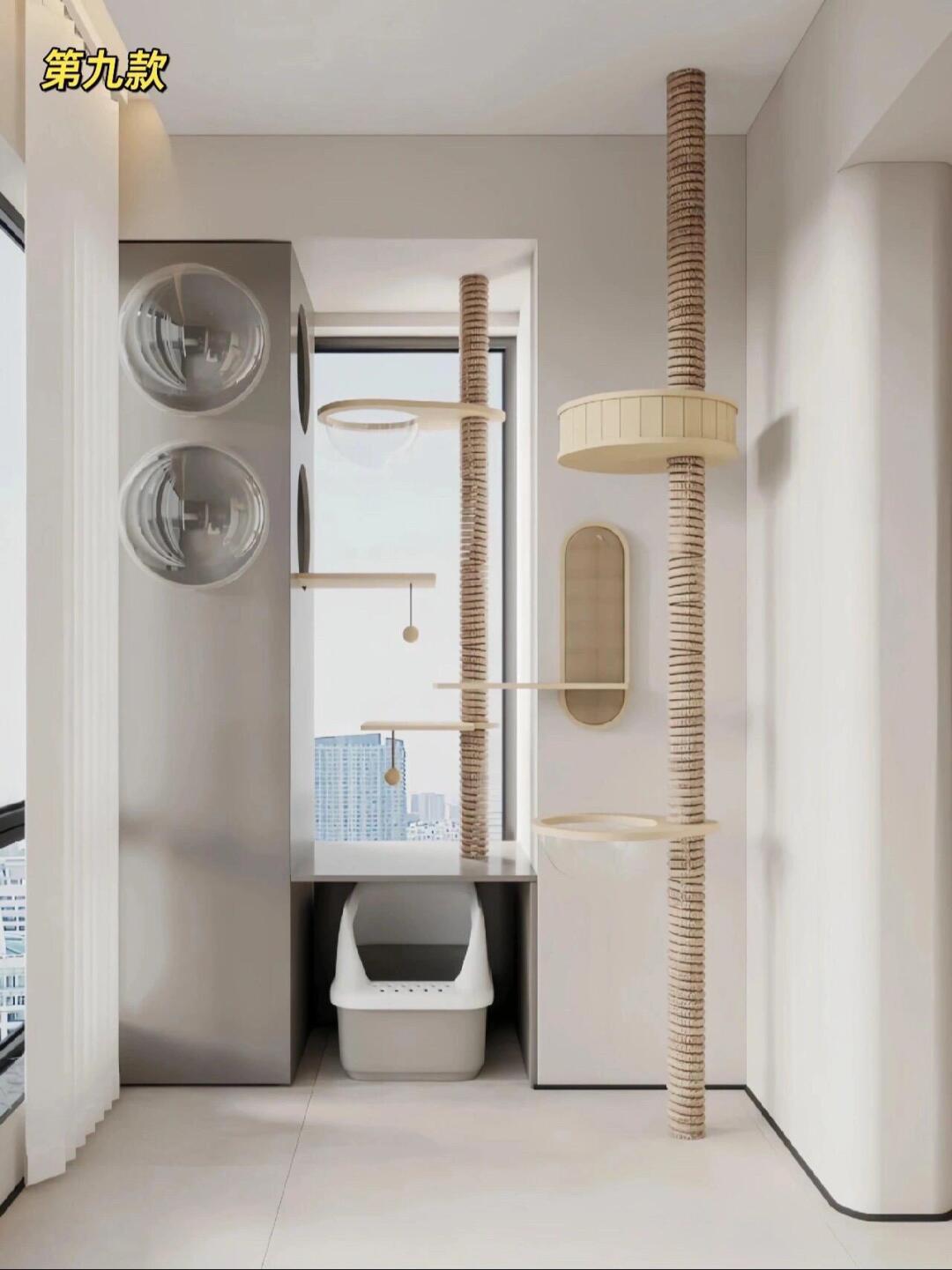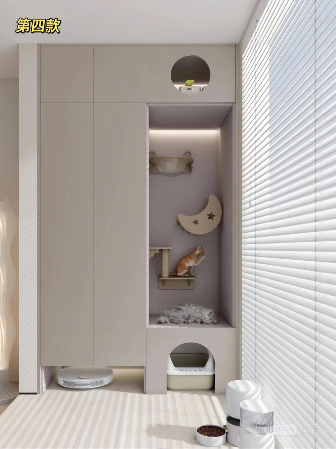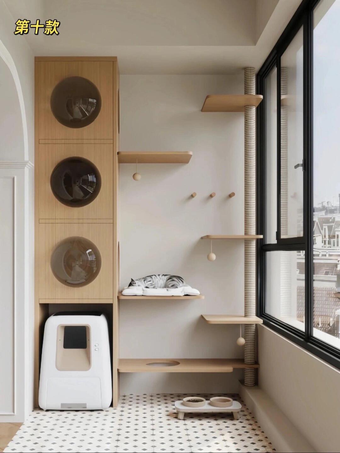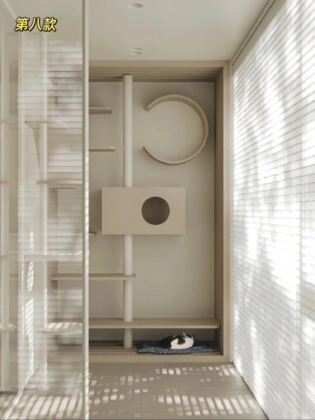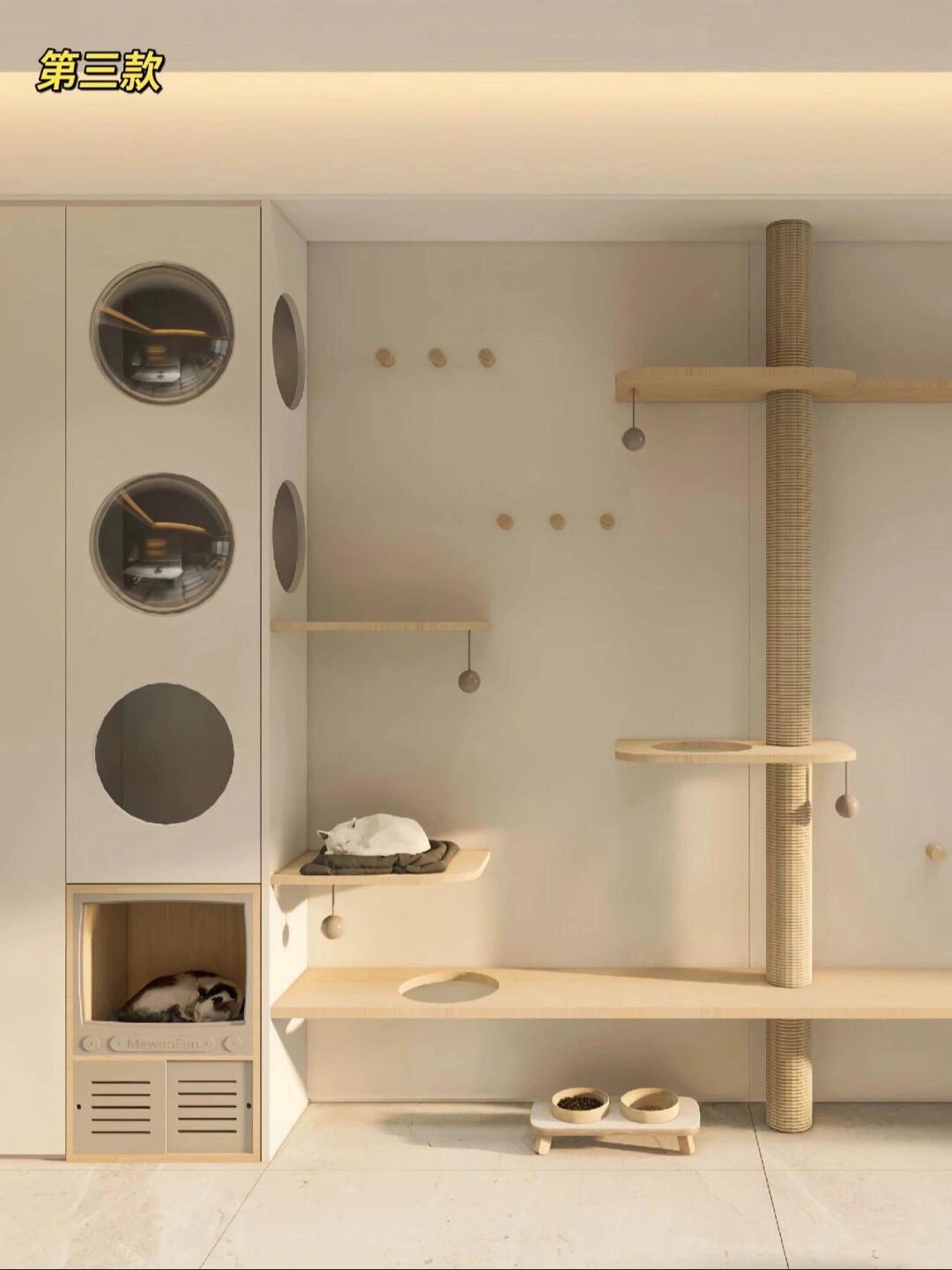材质选实木、藤编,耐磨还能磨爪,不用额外买猫抓板。 布局上藏露结合:封闭区做猫窝、猫砂盆收纳,开放区设跳台、瞭望窗,有的还嵌进阳台柜、玄关柜里,颜值实用双在线。